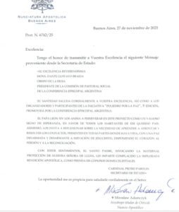 El 27 de noviembre monseñor Dante Braida recibió una nota de la Secretaría de Estado del Vaticano en donde, el Papa León saluda y anima a los organizadores y participantes de Poliedro por la paz